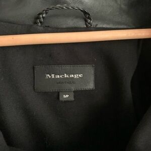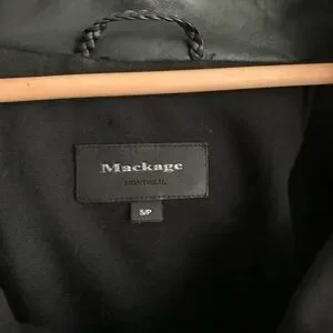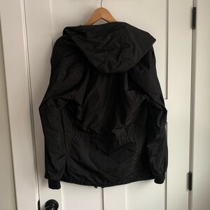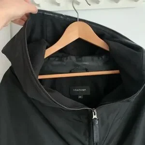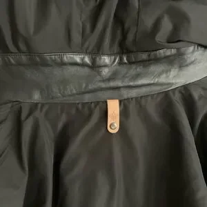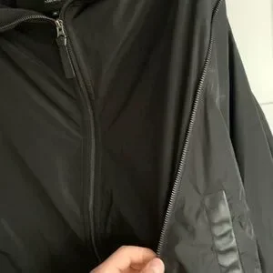 Good condition, no major flaws. Interesting model, two different zipper tracks can be used, hood zips all the way up. Mostly made of polyester, with lamb skin/leather elements throughout. Measures 22 inches pit to pit and 27 inches tall.