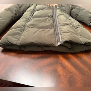 Chic olive green puffer with raccoon fur trim. Ideal for cold weather. Like new condition.