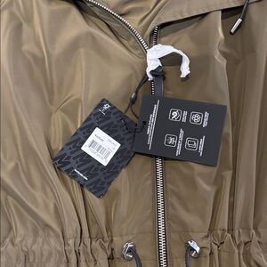 Melany is a mid-length rain parka featuring a removable bib with an adjustable drawcord storm visor hood. Made from a 100% recycled 2-layer water resistant shell, it has a semi-fitted silhouette, centre front zip closure with stand collar, adjustable drawcord waist, adjustable cuffs, and dual-entry zip waist pockets with hidden snap flaps. An M logo patch details the left sleeve. Water resistant, repellant, and windproof.