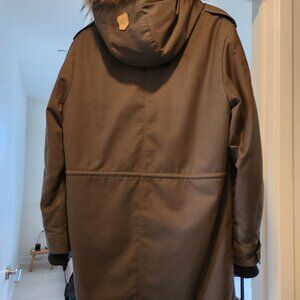 Shell : 70% polyester, 30% polyamide/nylon. Lining: 100% polyester. Filling: 90% duck down, 10% feathers. Fur: 100% finland silver fox. Fur 2: 100% rabbit.