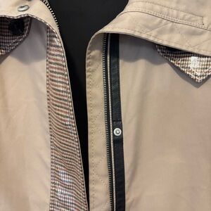 Chic and elevated, this Mackage Montreal coat blends modern tailoring with heritage-inspired details. Crafted in beige with glossy houndstooth trim at the placket, pockets, sleeves, and back yoke, it offers a polished look for transitional weather. Features a zip and snap front, wide collar, and belt loops (no belt included).