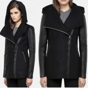 Mackage Odilia Black Wool & leather moto Jacket w/ removable hood XS EUC