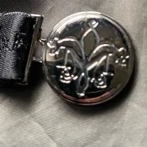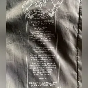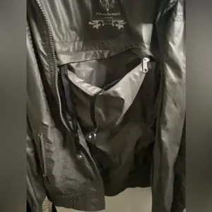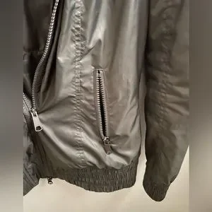 Excellent shape. Barely worn. This grey rain jacket fold into itself and becomes a pouch. It has a hidden hood in collar zip close pockets. (Does not need a special leather dry cleaner (lol)) its on the label. Lol. Not one flaw that i can see