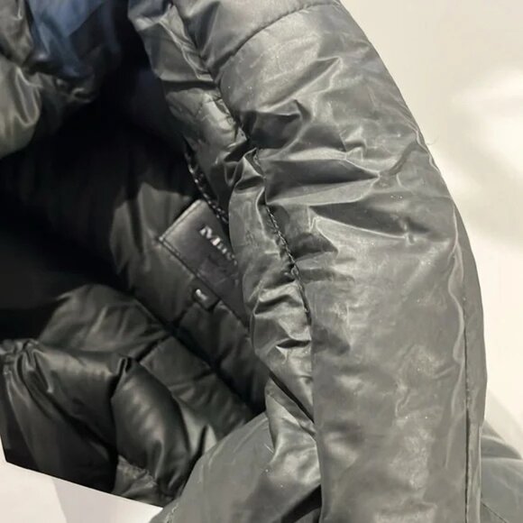 The Qeren down jacket from Mackage is made in a green channel-quilted nylon, and is insulated with duck down and feathers. It features long zip-detachable sleeves to convert to a vest, an oversize collar, an asymmetric zip front with leather trim, two sideseam zip pockets, and an embossed leather logo tag on the back.