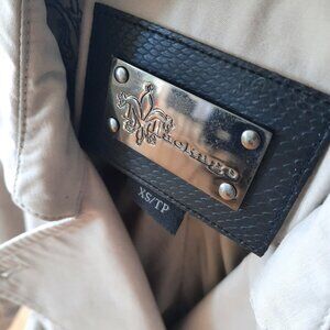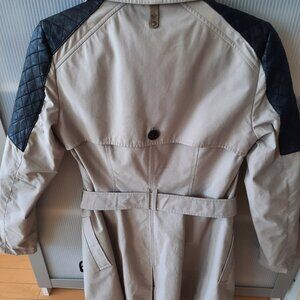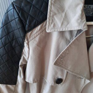 Women's Mackage trench coat in a light beige with quilted leather shoulder details and a belt. Good condition but just noticed a small mark on the back, not sure about it but I will include a photo. Size xs.