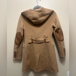 Has a hood, buttons up the front has leather elbow pads and 4 front pockets
