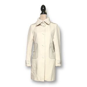 Mackage Cream Coloured Mid Length Wool Overcoat with Leather Accents, Size Medium