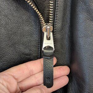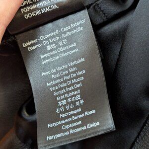 From the website: This cropped biker jacket is impeccably crafted from sustainable leather with a rich textured grain. Boasting an oversized fit and epaulette drop shoulders, it has an asymmetrical zip, notch collar, and tapered zip sleeves for a classic feel. A distinctive embossed wordmark accents the roller buckle belt. A luxe lifetime piece for statement styling. 100% Leather; Lining: 100% Acetate. Notch lapel. Long-sleeve. Zipper closure. Made in South Korea.