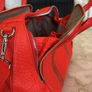 Made of sturdy pebbles grained orange leather with suede detailing. Dual rolled handles, double zip around closure, lined interior with one zippered pocket and two slip pockets.