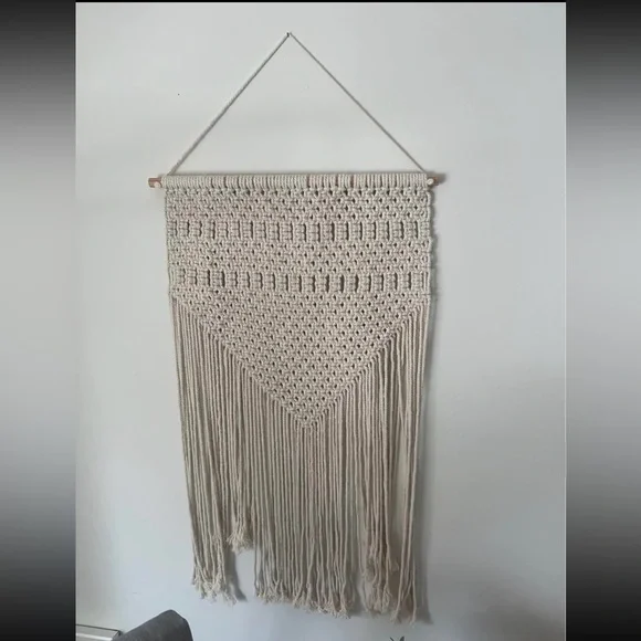 Excellent condition macrame wall art. Measures approx 19” across and 32” from wooden dowel to bottom fringe