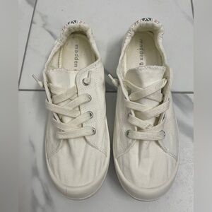Madden Girl white sneakers with colorful heel detail. Worn a few times, not the right fit for me. Perfect for everyday wear. Comfortable and stylish.