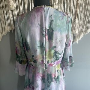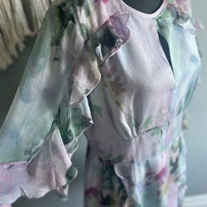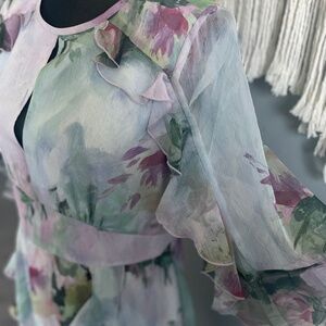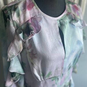 Fits true to size, order your normal size Designed to hit above the knee Round neck with keyhole Elbow-length sleeves Banded waist Ruffled trim throughout Hidden back zipper Lined Shell & lining: 100% polyester 35.5” in length