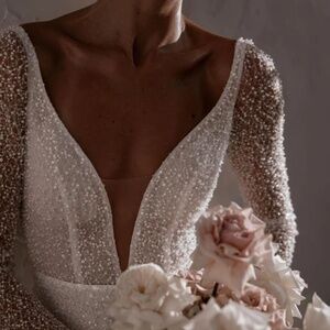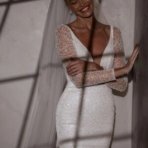 Featuring exquisite pearlescent beading, Margot shimmers with every movement, with her long sheer sleeves. A contoured low back enhances the silhouette, offering a modern edge that feels both bold and effortlessly chic.