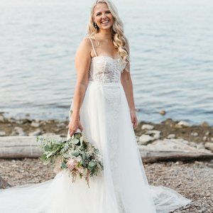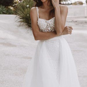 The most beautiful overskirt for any dress! I was so happy to have had this on my wedding day and it added such a bridal feel to my look. I love that it has the gap so you can still see the details of your dress underneath. I wore mine for my ceremony and took it off for the reception, so it felt like I had 2 separate looks!