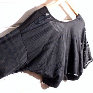 Up Cycled and hand made in California. This top features a gorgeous solid black front and an alluring black stripe/peakaboo back.