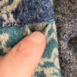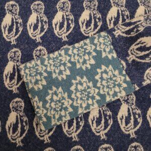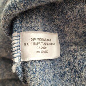 Colour is a dark blue with off white birds. Muted teal cuffs. Has a little stretch. 100% wool, Made in Canada.