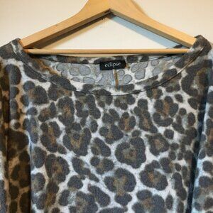 Very good preowned condition, jaguar spot/animal printed tops by Eclipse in brown, tan, black and greyish beige. Made in Canada, this top features a wide rounded neck and dolman style sleeves that taper at the cuffs. Very flattering and stylish. Another one for the car lovers.