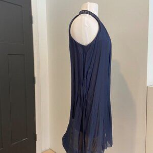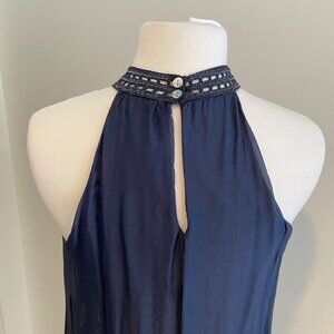 Made in Italy Halter dress Neck dress in delicate and lightweight silk blend in midnight blue shade, Sleeveless Chiffon Dress With Embellished sequins Collar.
