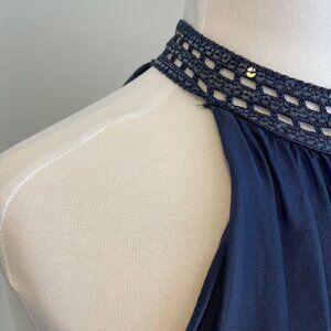 Item keywords: dark blue dress, chiffon dress, halter neck, embellished collar, sleeveless dress, formal dress, women's fashion, evening wear, cocktail dress, stylish dress, elegant dress, lightweight dress, professional wear, summer, springtime, resort wear, lightweight, feminine, quiet luxury , timeless classic.