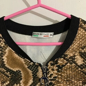 Made in Italy very cute bomber jacket with a snake print style, pre-owned very good condition, polyester and spandex fabric composition.