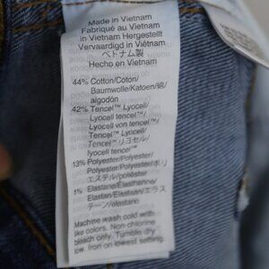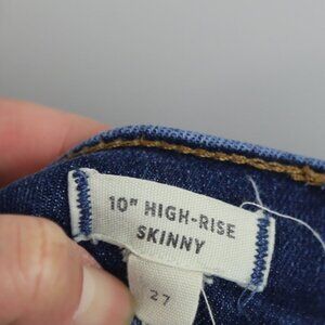 Pockets™ in front, these 10" high-rise skinny jeans are lean and legs-for-days sexy. The fabric: premium vintage-y stretch Cone® denim that hugs the body and bounces back like a pro (AKA no 3pm bagginess). 44% cotton, 42% tencel lyocell, 13% polyester, 1% elastane. Condition: some thread loosened near the crotch, small denim fraying on the back bottom, denim softness. Waist is loose - actual waist measures to 29 inches (14.5 inches across), while the tag says size 27.