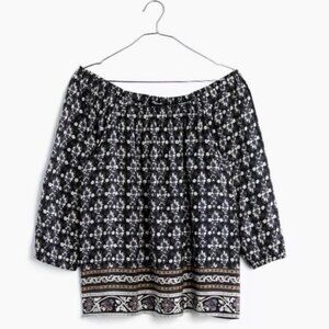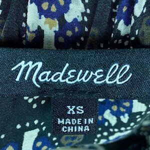 Madewell Gardenhouse Off-The-Shoulder Top 100% Silk in Abstract Floral in Women's Size XS. Style # F8172. Black with floral print. Dry clean. Excellent pre-loved condition. No visible flaws.