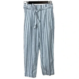 In like-new condition from Madewell - these linen-cotten blend pants feature a paperbag waist, and a striking stripe pattern. Style AN839. Button and zipper closure, tie belt for waist. High waist. Side seam pockets. Spare button attached. 25" length. 55% linen, 45% cotton.