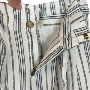 In like-new condition from Madewell - these linen-cotten blend pants feature a paperbag waist, and a striking stripe pattern. Style AN839. Button and zipper closure, tie belt for waist. High waist. Side seam pockets. Spare button attached. 25" length. 55% linen, 45% cotton.