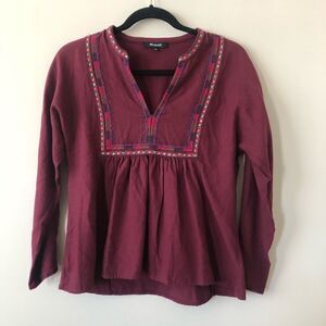 Pop-on peasant top with artful three-color embroidery dotted with little metal sequins. Fuss-free meets festive?