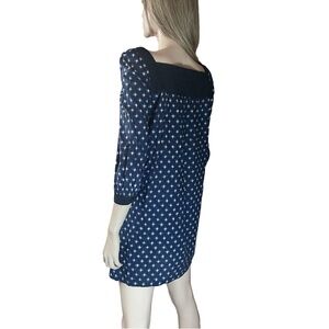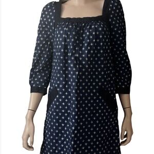 Features: Pull over design, squared neckline (elasticized at front), tunic shift style silhouette, mini length, ΒΎ sleeve with pearlized button close, solid navy trim, roomy banded front hip pockets, gathering at upper front bodice and back afford some flexibility of fit, no stretch fabric