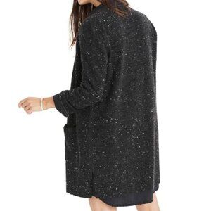A longline cardigan knit in soft, speckled donegal yarns with layer-ready side slits is great to wear in the winter months (or when the office is really cold).