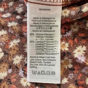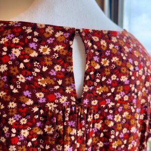 Madewell floral print tee in rust with poppy, lavender, peach, and black print. Size small, can easily fit a M. Bust measures 22.5 inches laying flat (has slight dolman sleeve), length from shoulder to hem is 19.5 inches at the front and curves down to 21 inches at the back. Excellent used condition. Cat friendly, nonsmoking home.
