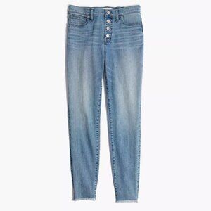 Madewell 9" High-Rise Skinny Crop Jeans: Button-Front Edition in Women's Size 25. Lean and legs for days sexy, these high-rise jeans have an extra layer of holds-you-in sorcery in front, thanks to supersleek Magic Pockets. This pari has perfect worn-in button-front with cool raw hems. Sits above hip, fitted through hip and thigh, with a skinny leg. Premium 92% cotton, 6% poly and 2% elastane denim from Italy's Candiani mill. Style # J0505. Machine washable. Very good pre-loved condition. No visible flaws.