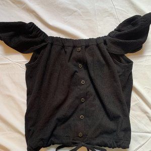 Off the shoulder, cute black crop top with tie and button details. Perfect summer casual top. Great condition, worn once. Cotton/Polyester Blend.