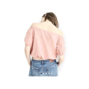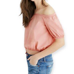 Madewell off-shoulder bubble top in a soft pink hue, made from 100% cotton for comfort and versatility. Perfect for pairing with denim or khakis.