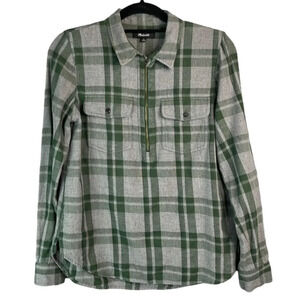 Madewell Plaid Flannel Quarter Zip Pullover Shirt Forest Green Grey Size Small
