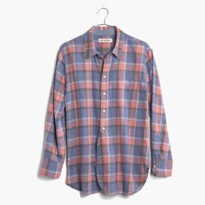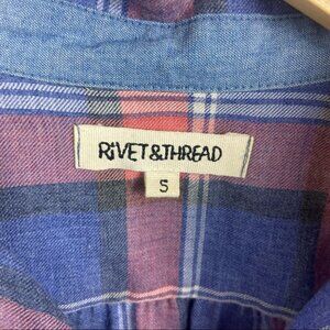 Madewell Rivet & Thread Button Down Shirt in Harvey Plaid and Women's Size Small. Limited edition. Lightweight button-down shirt. PInk and blue plaid. Popover style. Collared. Button cuffs. Split hem. Machine washable. Very good pre-loved condition. No visible flaws.