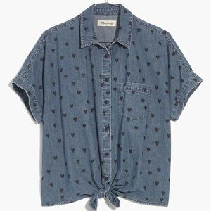 Madewell Short-Sleeve Tie-Front Denim Shirt in Heart Print Size Small