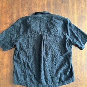 Chic black button-up shirt with a unique textured pattern. Ideal for versatile styling.