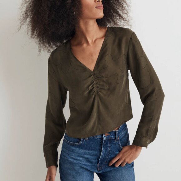 Madewell Womens Ruched Front Cupro Top Green Long Sleeve Size 4 Earthy Boho