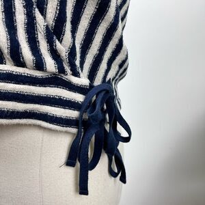 Made of textural striped jacquard, this faux-wrap top ties at one side with double laces (yep, it's pretty cute). A warmer-weather favorite in the making. True to size. Cotton/poly/other. Machine wash.