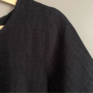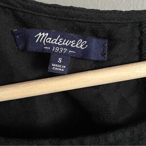 Picturing a womens black silk novella mini dress with scoop neck and scallop back detail by Madewell in a size small.