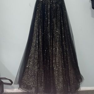 never worn Madison James black and gold a-line prom dress. beautiful material, super sparkly, spaghetti straps, round neckline and back, dress can be altered. has never been worn still has tag. purchased about a month ago. sadly cannot wear it since I'm not attending my prom:(