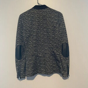 Stylish open front blazer by Madison Scotch with zipper cuffs, elbow leather patch work