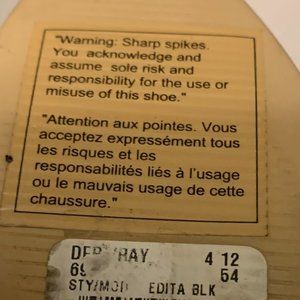 Warning, sharp spikes. You acknowledge and assume all risks and responsibility for the use or misuse of this shoe.
