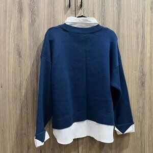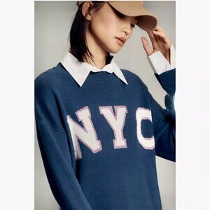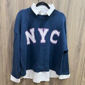 Maeve Anthropologie Graphic Twofer NYC sweater in size medium. This long-sleeve sweater is a "twofer" or layered look with a white collar and cuffs attached to a blue sweater. Sweater has the letters NYC across the front and is designed to look like a sweater layered over a collared shirt. Sweater and blouse parts are made from cotton and acrylic.