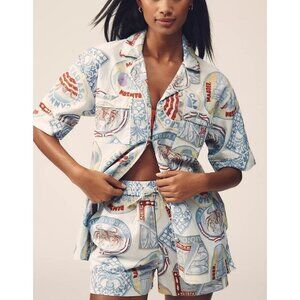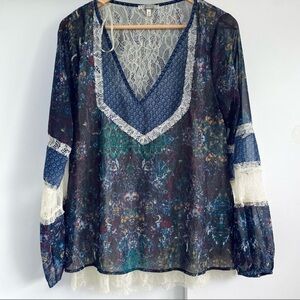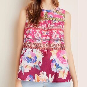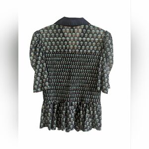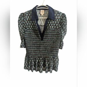 Maeve Anthropologie Short-Sleeve Smocked Polo Top Navy Floral Boho Preppy SZ M