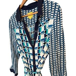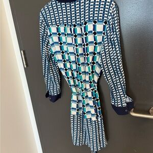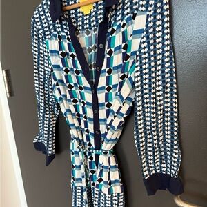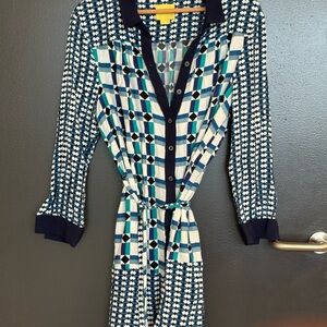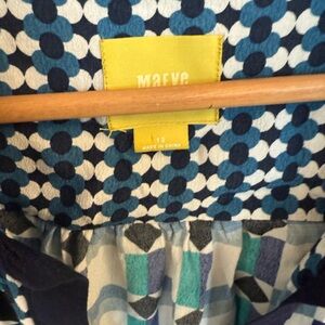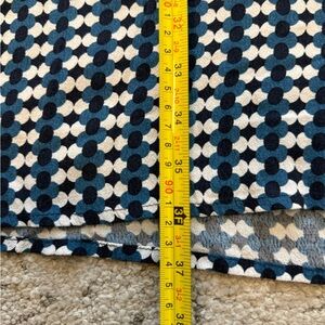Maeve size 12 GUC dress features a striking blue and white geometric print, perfect for both work and casual occasions. With its 3/4 cuffed sleeves and crew neck, it offers a blend of style and comfort. The straight silhouette and bold pattern ensure it stands out in any setting.
