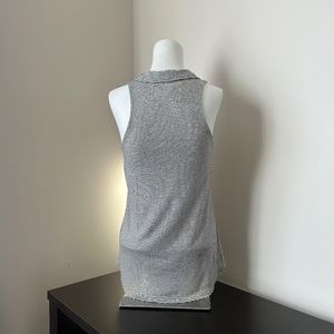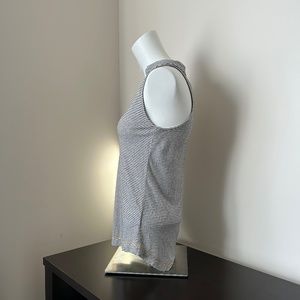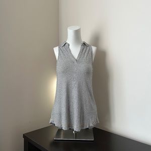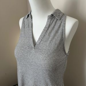 Maeve striped sleeveless top, size x-small. V-neck with collar. Black and white colour. Rounded hem with contrasting stitches. Lightweight jersey fabric; 82% rayon, 18% linen.