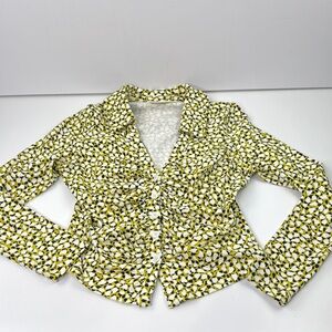 This elegant Maeve top features a striking green and cream animal print, complemented by a notched collar and ruched detailing. The fitted silhouette and button-down style make it a versatile choice for both formal and dressy occasions.